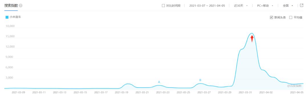 2021年3月30日前后全网对“小米造车”搜索量分布,截图自百度指数