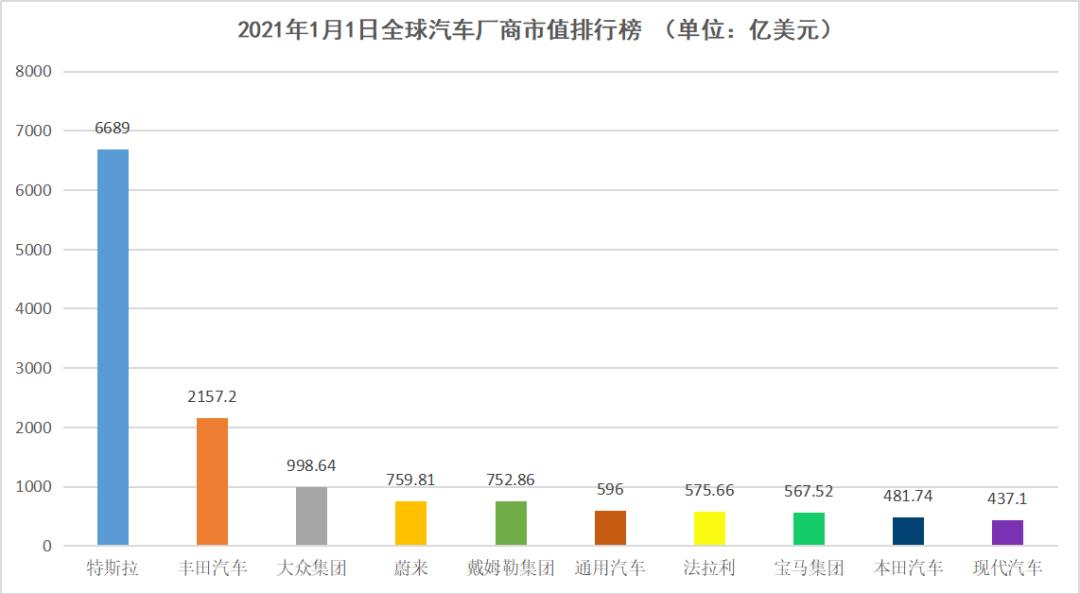 2021年1月1日全球汽车厂商市值排行榜,数据来源于盖世汽车,连线出行制图