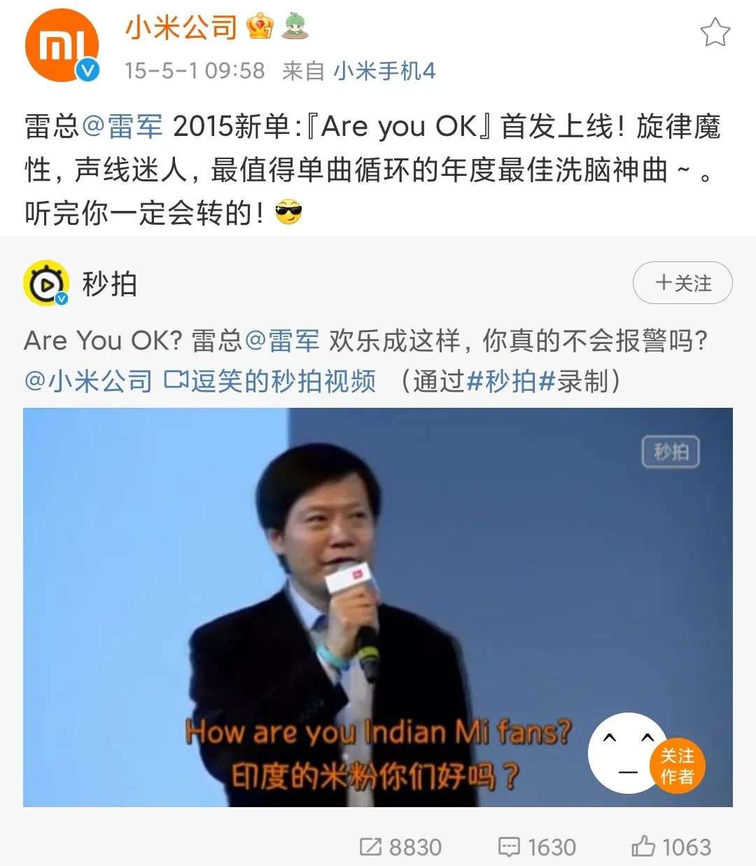 雷军与它的“Are You OK?”,图源小米公司官微