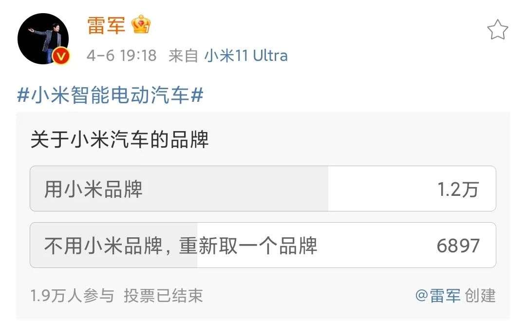 雷军发起小米汽车品牌的投票,截图自雷军个人微博