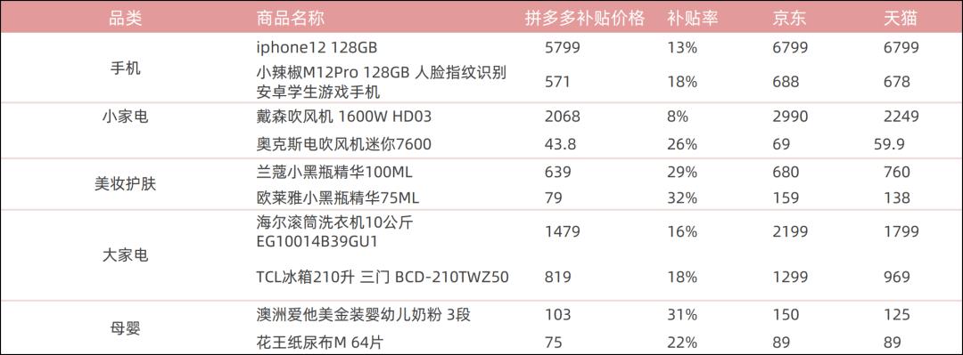 对“iPhone手机、戴森吹风机、兰蔻小黑瓶、花王纸尿布”等知名产品补贴20%左右,实现从基本款消费(低价/白牌/刚需)到悦己式消费(名牌/IP/设计感)的升级,以期改变用户心智,与阿里巴巴一较高下。