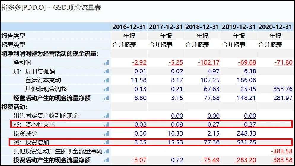 3)拼多多最“软”。2016年至今的成长期,拼多多几乎没什么资本性开支,投资也绝大多数是短期理财。