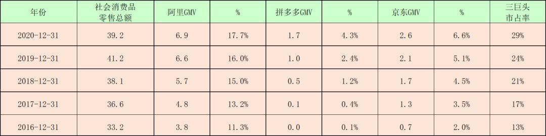 图9:2016-2020年社零及电商GMV数据,来源:锦缎研究员整理