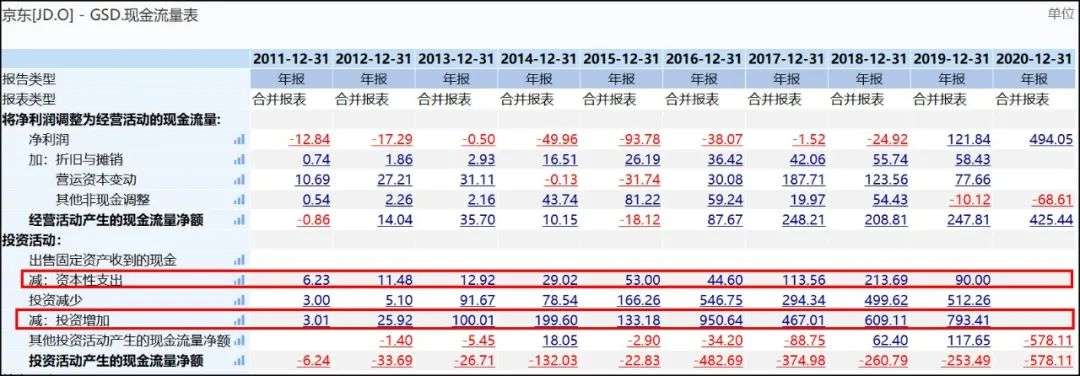 1)京东600亿基建。过去十年京东资本性支出在600亿上下,从投资增加额看,其2015年开始对供应链金融支持的力度很大。