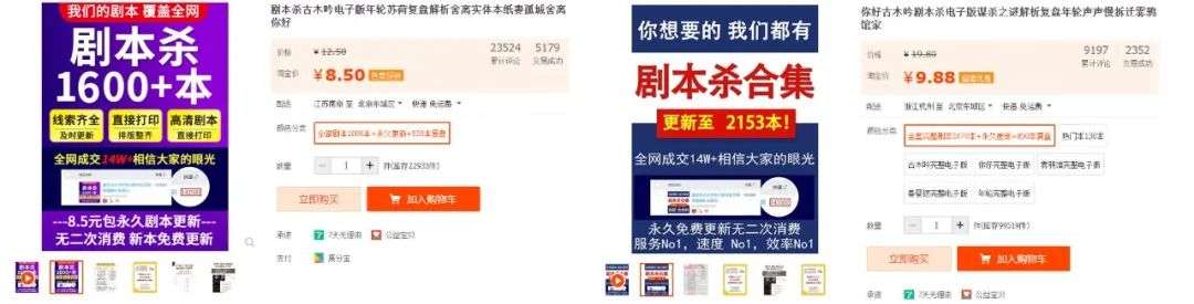 在淘宝上,《你好》、《古木吟》等1070本全套完整剧本售价9.88元,交易成功显示2352本,累计评论9197个。还有《古木吟》、《年轮》等1000本的合集,售价8.5元,交易成功5179本,累计评论23524个。