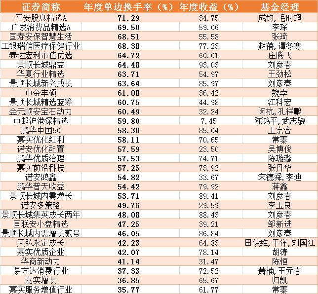 偏股混合型基金中,则有55只基金单边换手率不到100%。最低的为常蓁执掌的嘉实服务增值基金,该基金2020年度单边换手率只有35.77%,是偏股型基金中换手率最低的。