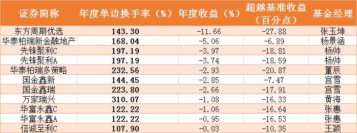 与此同时,还有11只灵活配置型基金在2020年不仅没有收益,反而还出现亏损,而这11只基金全部都是低换手率的类型。 数据统计显示,这11只基金中换手率最高的为黄海掌管的万家瑞兴,2020年单边换手率为310.07%,2020年亏损1.08%。不过,该基金在去年四季度期间发生了基金经理变动,老基金经理孙远慧离职。