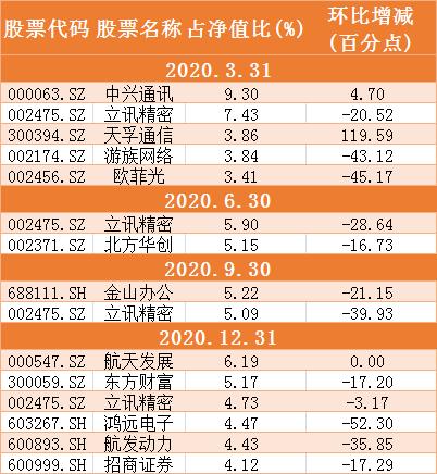 长城双动力2020年各季度前十大重仓股中占净值比环比出现变化的标的