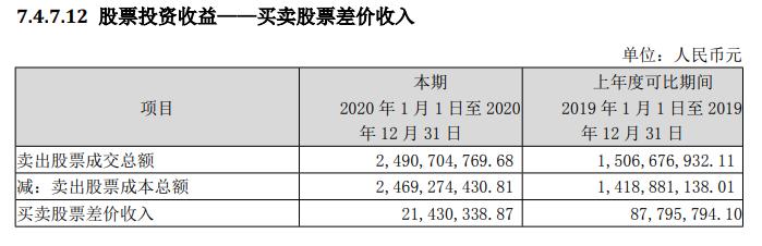 上图为长城双动力2020年报中披露的股票投资收益。由此可以看出,该基金2020年度买入股票成本总额约为24.69亿元,卖出股票成交总额为24.9亿元。Wind数据显示,其2020年度日均资产净值约为2.34亿元,由此不难计算出该基金2020年度双边换手率为2077.613%,单边换手率为1035.83%。