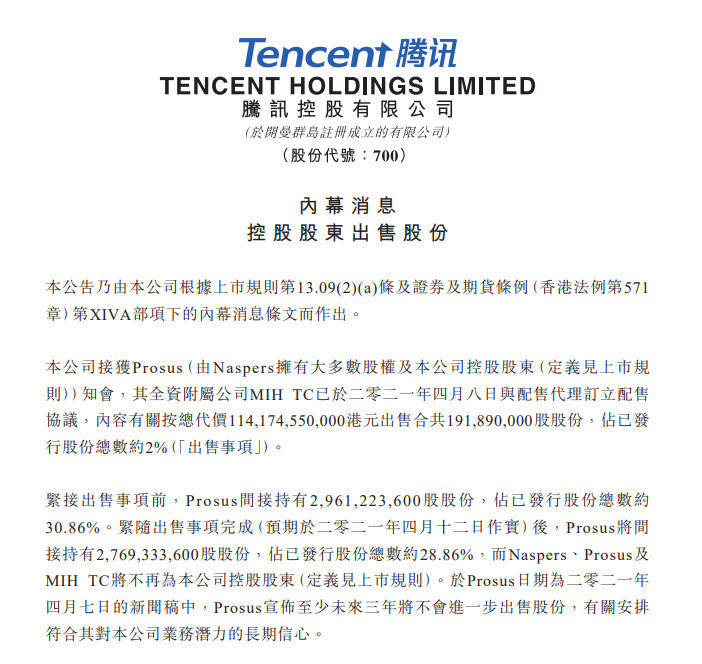本公司接获Prosus(由Naspers拥有大多数股权及本公司控股股东(定义见上市规则))知会,其全资附属公司MIH TC已于二零二一年四月八日与配售代理订立配售协议,内容有关按总代价114,174,550,000港元出售合共191,890,000股股份,占已发行股份总数约2%(「出售事项」)。