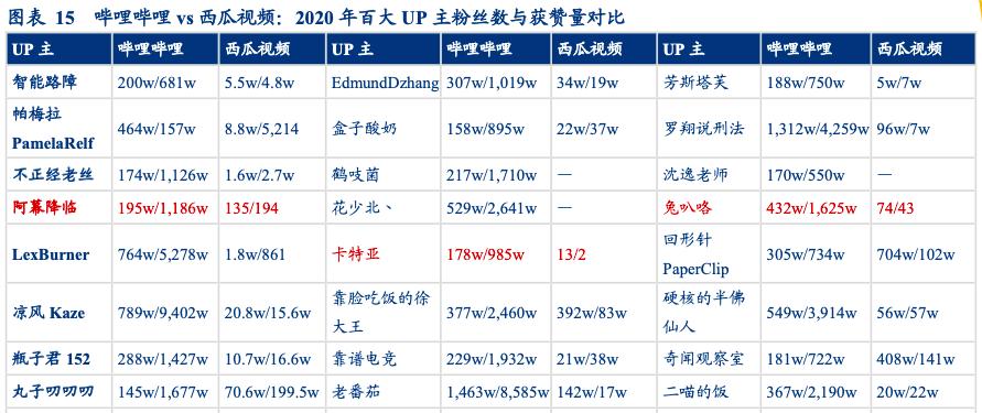 根据华创证券发布的报告,尽管西瓜视频重金挖人,B站对于UP主仍具有不可替代性。这主要表现在两平台不同的“粉丝数/获赞量”的比值上。以2020年百大UP主为例,这些人在B站的平均粉丝数/点赞量为356万/1860万,而西瓜为155万/92万。无论是粉丝基数,还是获赞程度,B站的社区活跃度都具有不可替代性。