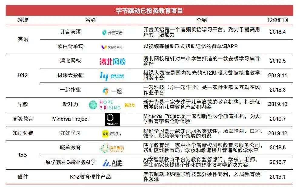 2018年起,字节跳动教育领域陆续推出GOGOKID、清北网校、瓜瓜龙启蒙、开言英语、极课大数据、AI学、教育硬件等多项产品及业务。比起传统教育行业地推式增长,字节跳动更注重产品思维和流量打法。