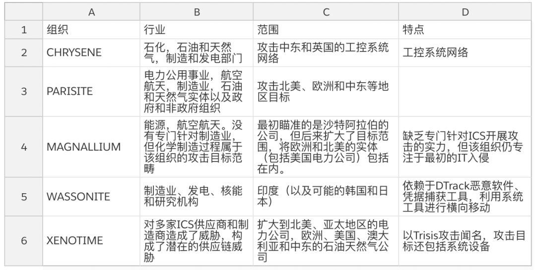Dragos目前公开跟踪了五个以制造业为攻击目标的组织:CHRYSENE、PARISITE、MAGNALLIUM、WASSONITE和XENOTIME,以前或目前都试图利用远程访问技术或登录基础设施。不难发现,能源网络特别容易受到网络攻击。
