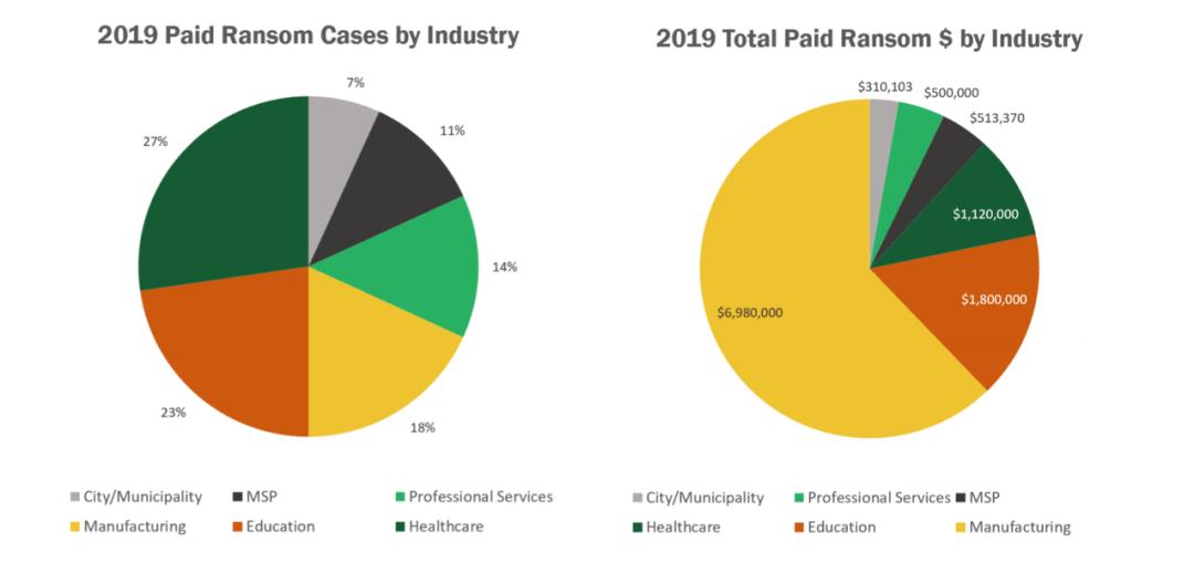 咨询公司 Kivu Consulting 2019年的一份报告数据显示,尽管在2019年支付的赎金事件中,制造业占18%。但赎金数额非常可观,2019年支付了680万美元的勒索软件付款,占总赎金额的 62%,高于其他任何行业。