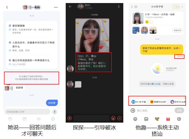 双方匹配成功后,就到了互动环节。根据产品目的的不同,不同产品在这一步有一样的设定: