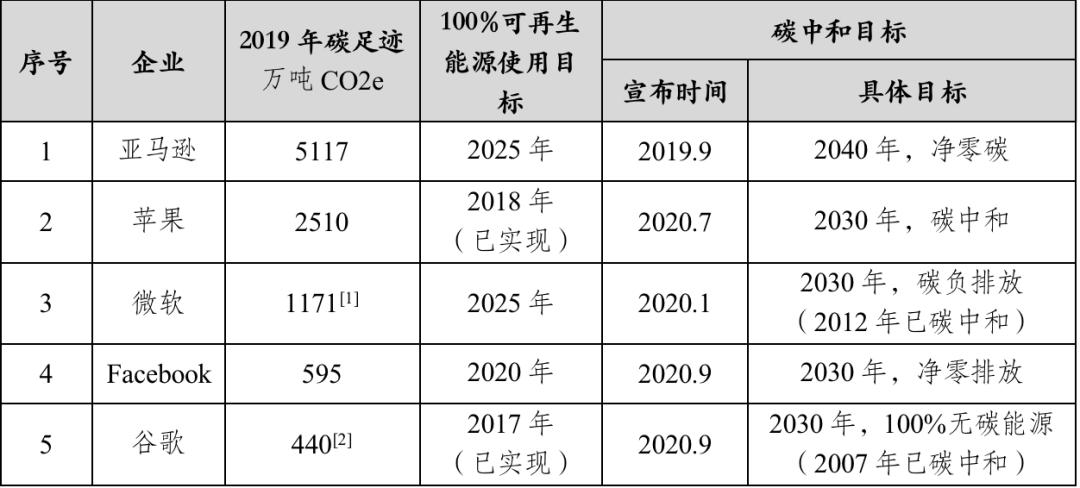 备 注[2]: 谷歌的碳足迹是2018年数据,包括范围1和范围2。 其他4家公司均是范围1、2、3的数据。