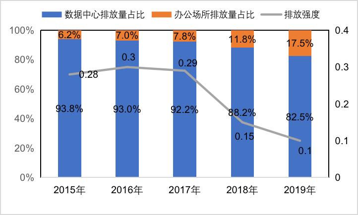 Facebook所拥有的数据中心数量由2015年初的4个增加到2019年底的15个。而数据中心排放量占比持续下降,由2015年的93.8%下降至2019年的82.5%。其排放强度已降至0.1,用户使用Facebook一年所产生的碳排放要比制作一杯黑咖啡更少。如下图所示。
