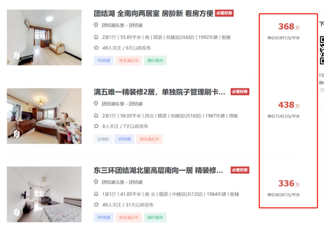 在临近东三环的团结湖商圈,相隔不远的两个小区,挂牌价价差能达到1-1.5万元/平米,相当于一套房子比另外一套贵出20%。