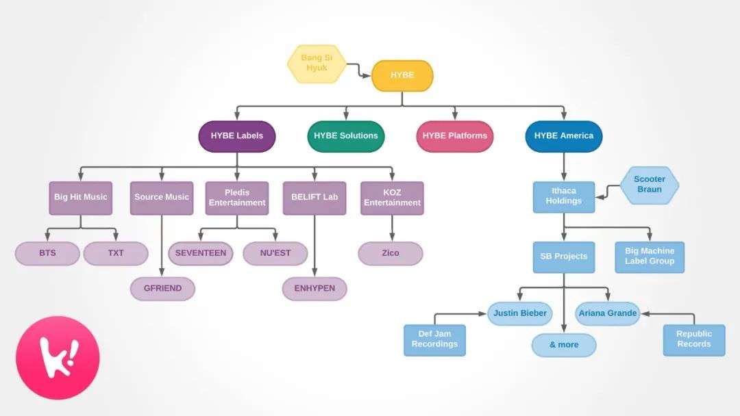 4月2日,HYBE在韩国金融监督院电子公示系统上发布多则公告,HYBE即将合并HYBE 360和HYBE IP;同一天,通过子公司Big Hit America收购美国知名音乐制作人Scooter Braun的媒体控股公司Ithaca Holdings(包括SB Projects和Big Machine Label Group)100%的股份,交易价格为1.07兆韩元(约合人民币62.5亿元)。