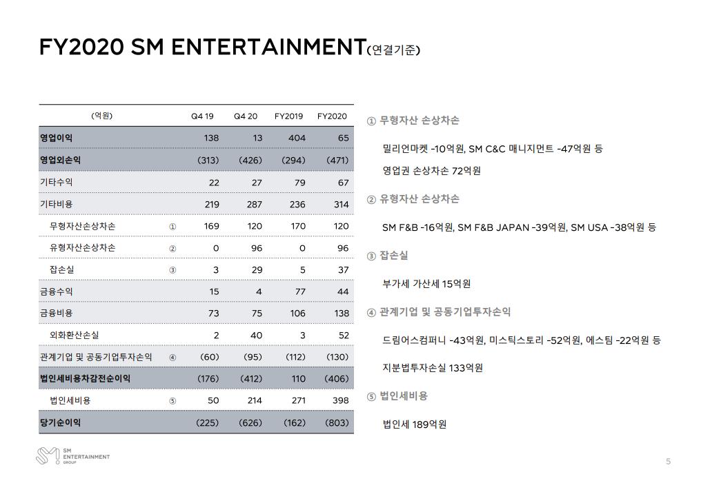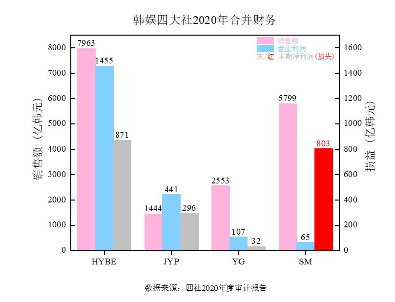 相比之下,子公司数量高达35家的SM娱乐就赤字累累了。纵有NCT以512万张的专辑销量力挺,公司专辑总销量激增至921万张,2020年SM合并销售额也出现了小幅下滑了11.8%,营业利润大幅缩减至仅65亿韩元(减少83.9%),本期净损失高达803亿韩元。即使去掉补缴202亿韩元的税务支出、排除133亿韩元的关联企业及共同企业投资损益,SM还是板上钉钉的赤字大户。