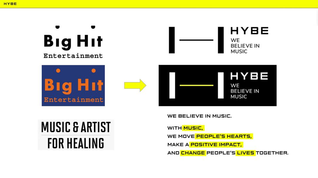 根据19日官方Youtube频道上传的品牌发布会显示,公司启用的新名称“HYBE”象征着连接、扩展、关系,蕴含了打造世界一流基于音乐的娱乐生活方式平台的愿景;公司使命也有所变更,由“抚慰心灵的音乐与艺术家”(Music & Artist for Healing)进化为更简洁的“我们相信音乐”(We Believe in Music)。以柠檬黄(HYPER LEMON)为强调色,HYBE也进行了全新的品牌视觉形象设计。