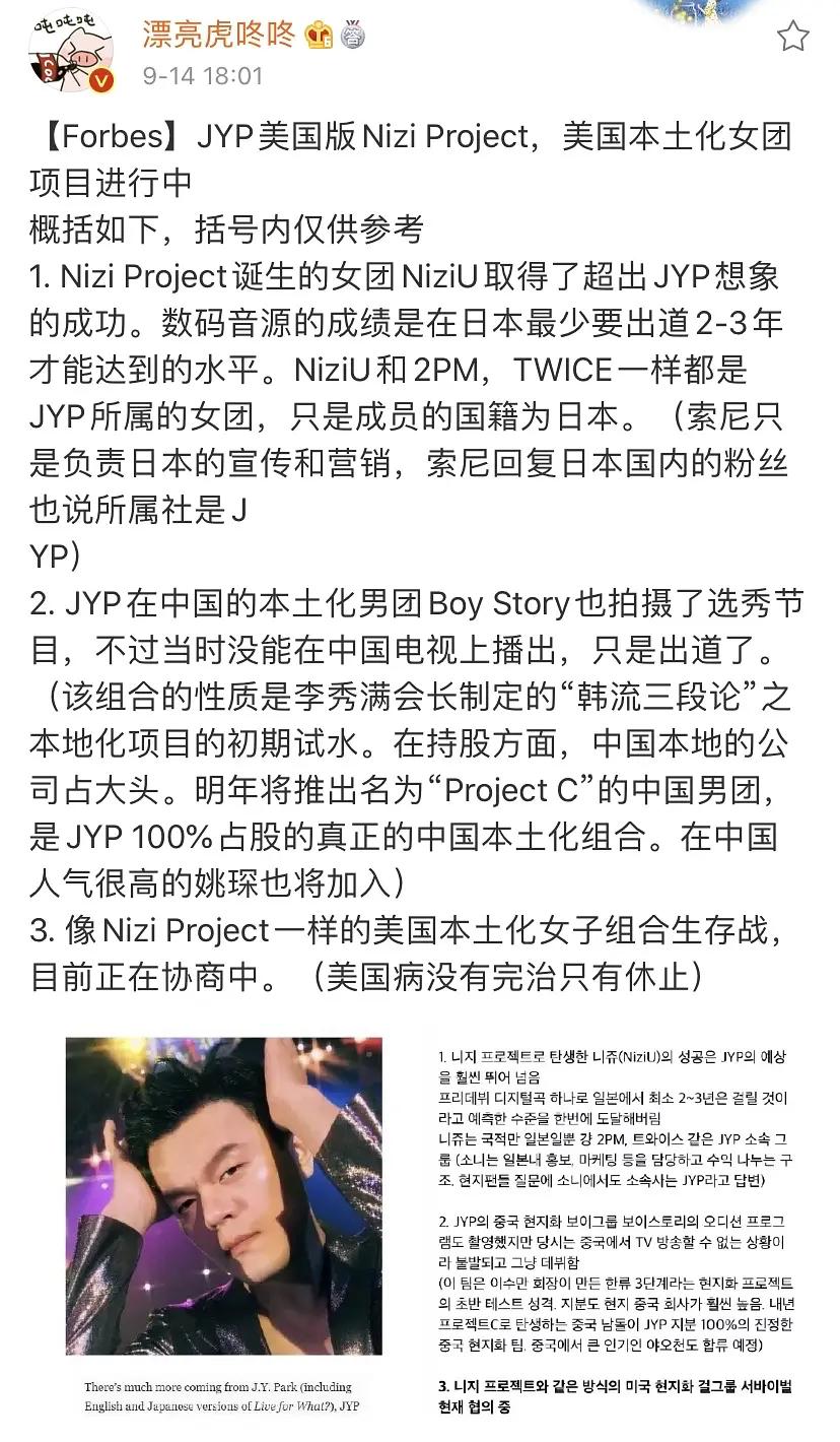 JYP娱乐也开始对本土市场以外重拳出击,今年上半年即将推出与鸟叔合作的新男团,除了固守本土的该团以外,余下3组企划全部面向海外,今年下半年推出的Project C主攻中国市场,有可能通过子公司北京杰伟品或泛领文化开始活动,之后将在2022年推出Nizi Project男版与创始人朴振英心心念念的美国新女团。