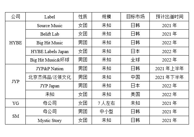 HYBE足足有五组新团正在策划,2021年的重点是女团,首先是Source Music新女团,出身SM的闵熙珍将在新女团的策划中发挥怎样的作用值得观察;然后是与CJ合作的女版Enhypen,不过Mnet今年的重点是通过《Girls Planet 999》选出的中日韩女团,Belift女团的出道时间很有可能延后到明年上半年。其次是2022年的2组男团1组女团,分别是Big Hit Music的TXT的师弟团、HYBE与环球音乐合作的面向全球市场的新男团以及HYBE Labels Japan企划的新女团。