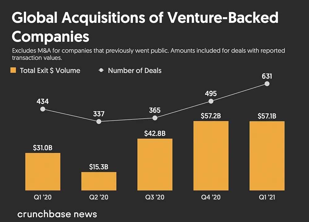 2021年第一季度并购速度加快,环比增长26%,同比增长44%,总计有15家获风投支持的公司进行了价值10亿美元的收购交易,这一数字低于2020年第四季度的20家。