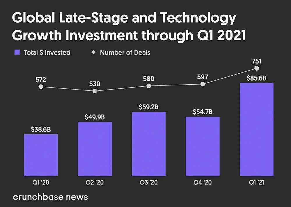 根据Crunchbase的数据,这是第一个超过1000亿美元的季度,融资额创下历史新高。