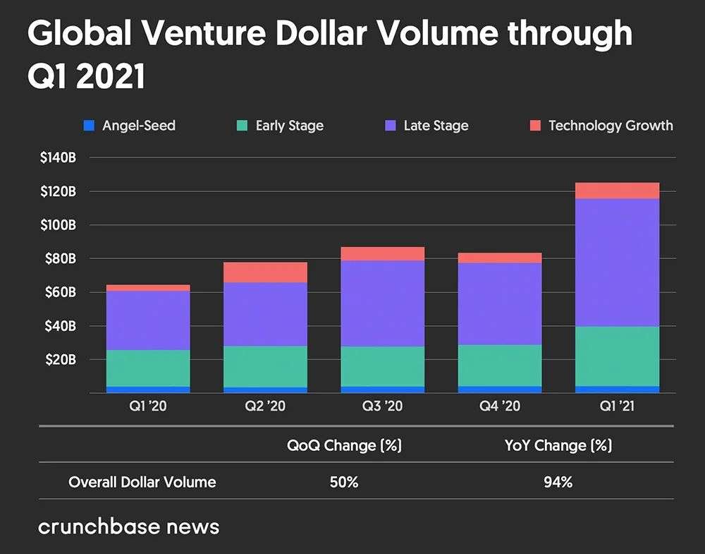智东西4月8日消息,美国企业服务数据库公司Crunchbase最新数据显示,2021年第一季度,全球风险投资总额达到1250亿美元,环比增长50%,同比增长94%。