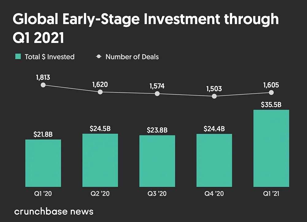 2021年第一季度早期融资金额猛增,达到355亿美元,环比增长45%,同比增长63%。
