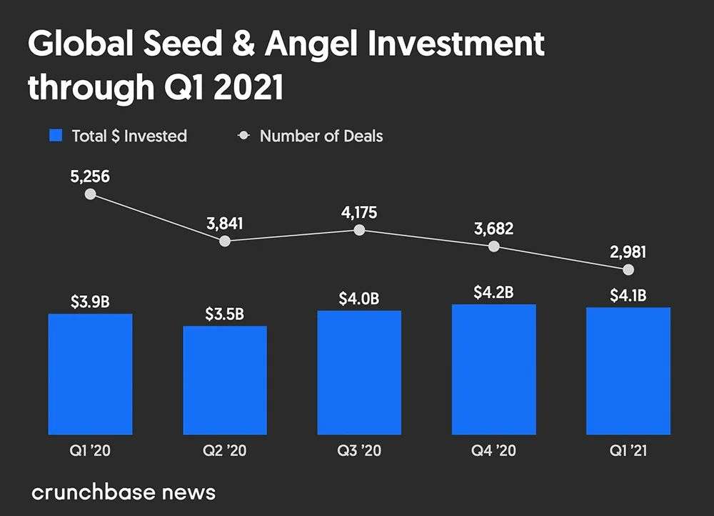 2021年第一季度,种子轮融资额相对稳定,风投总额达41亿美元,融资数量呈下降趋势。