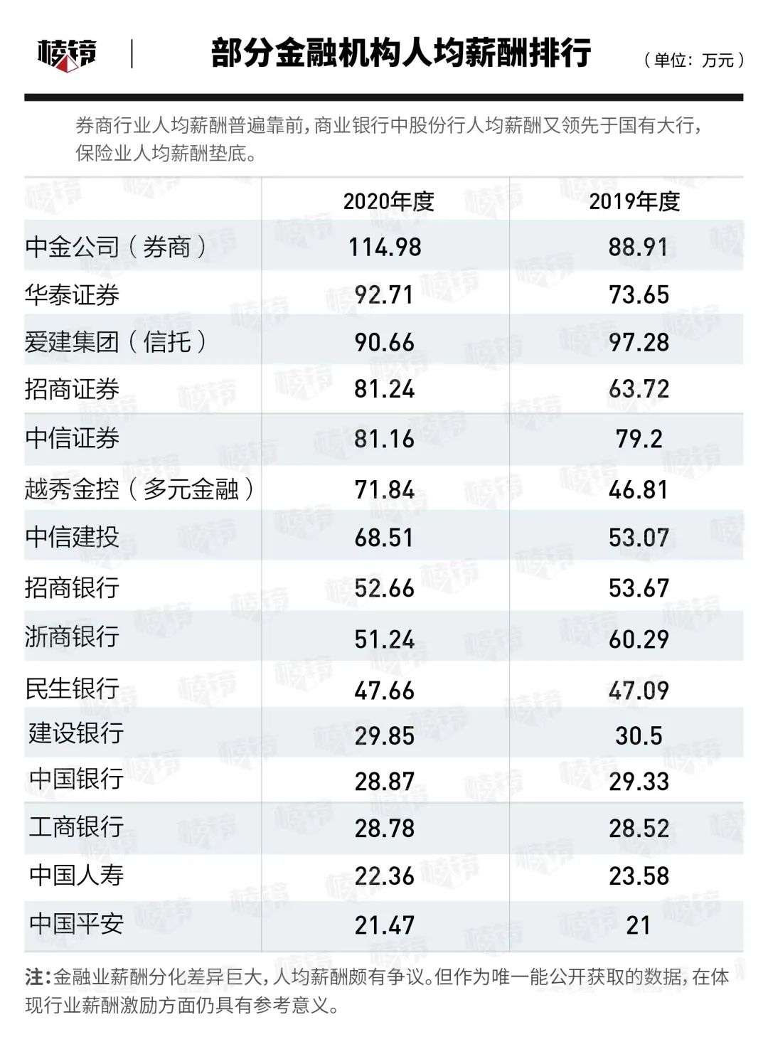 据Wind统计,2020年,在金融行业人均薪酬排行中,券商包揽前十名中的八席。中金公司以人均薪酬114.98万一骑绝尘,华泰证券、招商证券、中信证券和国金证券人均薪酬也都超过80万元。以信托为主的爱建集团以90.66万元挤进金融行业人均薪酬榜第三。