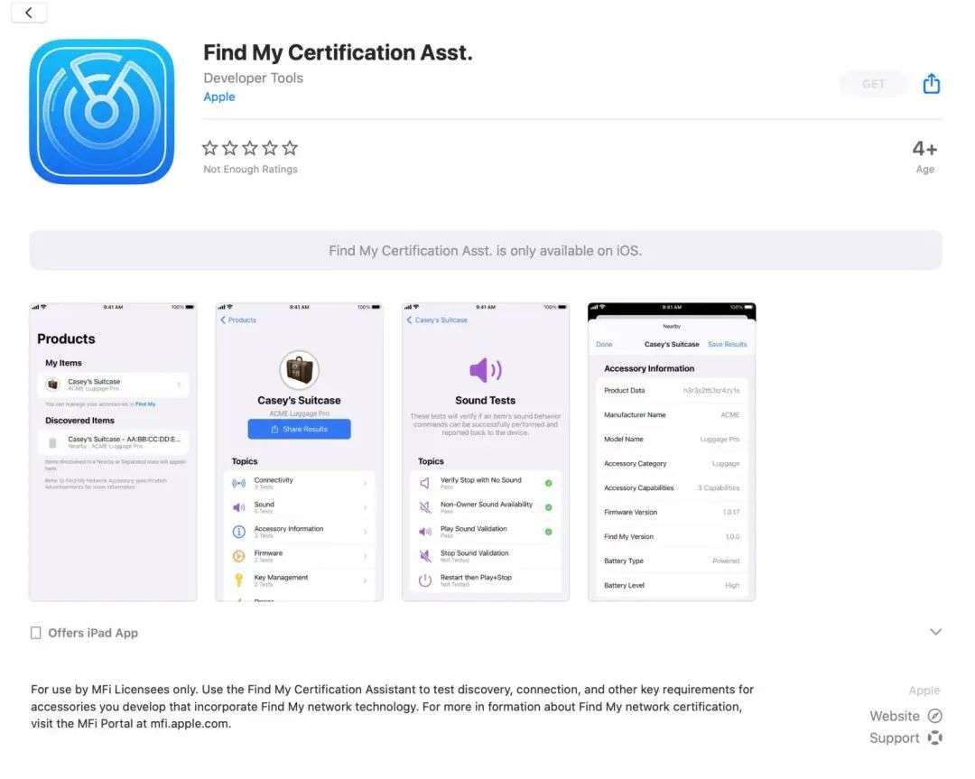 苹果公司放出最新消息:推出新应用“查找产品认证助手(Find My Certification Asst)”,用来测试第三方产品接入苹果官方的“查找(Find My)”功能是否顺利。