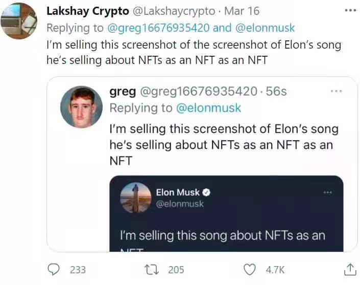当马斯克售出他那首关于NFT的电音歌曲之后,一位叫greg的网友发现了“商机”,他立刻表明自己要把“马斯克发的关于卖掉歌曲的推特”的截图当作NFT售出。