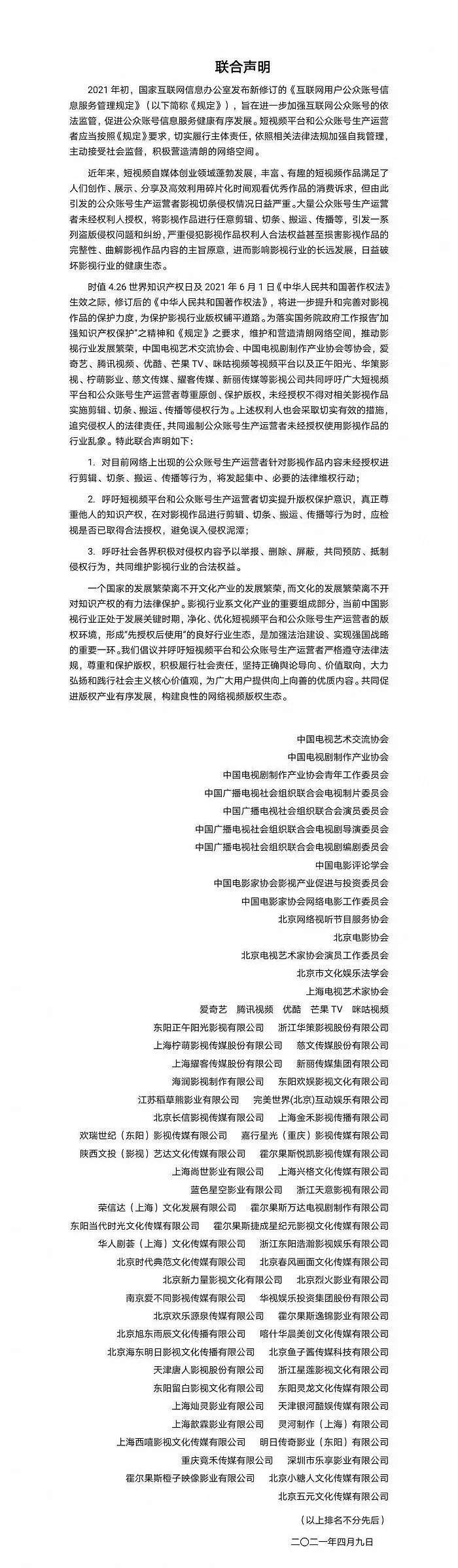 4月9日晚,53家影视公司、5家视频平台及15家影视行业协会发表联合声明,将对网络上针对影视作品内容未经授权进行剪辑、切条、搬运、传播等行为,发起集中、必要的法律维权行动。与此同时,声明呼吁短视频平台与公众账号生产运营者提升版权意识、呼吁社会各界对侵权内容予以举报、删除、屏蔽,形成“先授权后使用”的良好行业生态。