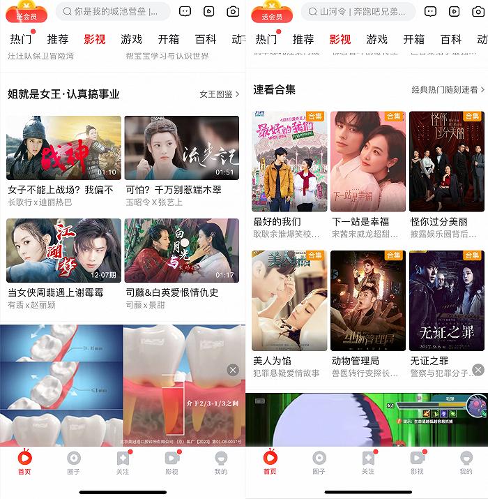 随刻APP影视区截图。左为以“女王图鉴”为主题的角色混剪/CP混剪,右为热门剧集速看合集。
