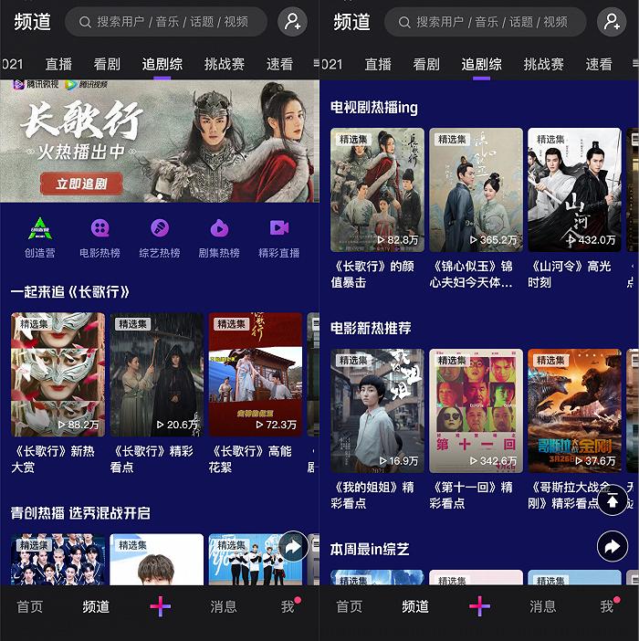微视APP“追剧综”频道截图。腾讯视频热播剧《长歌行》“精选集”被放在专区首页,而优酷热播剧《山河令》“精选集”排在电视热播的第三位。