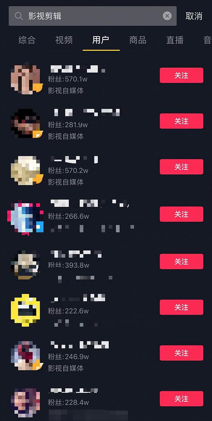 在抖音APP上搜索“影视剪辑”博主,部分博主粉丝量达到百万量级甚至五百万量级。