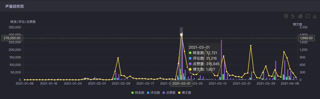 根据时趣洞察引擎,2021.01.08-2021.04.06区间监测,“易立竞”的社交声量趋势此起彼伏,可以看到和节目播出时间较吻合,也有随着节目热度本身话题发酵,带来二次讨论热度。比如3月1日的峰值,时间点是2月28日吐槽大会播出后,带来了一个套路点赞高峰值。