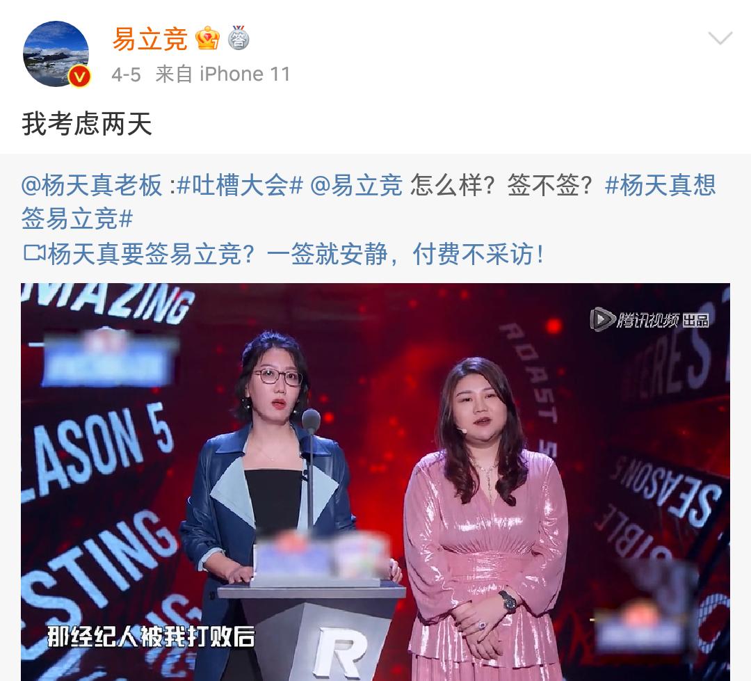 在节目中杨天真和易立竞的吐槽还提到,要签易立竞老师,不知道后续是不是来真的。