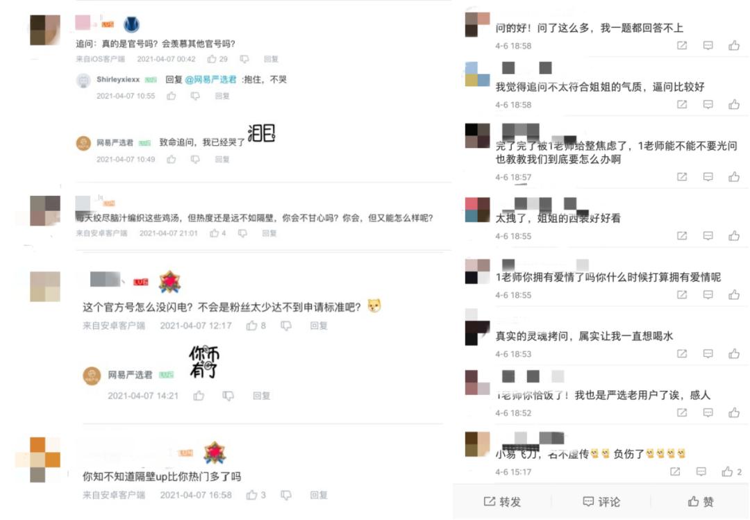从话题热度也可以看出,易立竞一吐槽,热度就来了,在个人影响力上极具爆发性,但话题热度持续性不稳定。品牌如果和1老师合作,后续话题的制造就需要好好思考了,如何发挥1老师的个人风格,犀利、致命的文案风格一定是首要的,前提是品牌需要准备好勇气,因为“易立竞真的很敢问”。