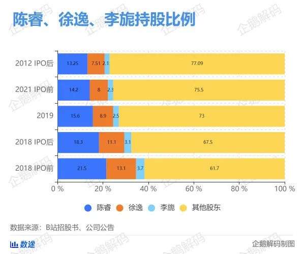 据B站2018年的招股书显示,在公司股权结构上,B站董事长兼CEO陈睿持股21.5%,为第一大股东,创始人兼总裁徐逸持股13.1%,副董事长兼COO李旎持股3.7%。