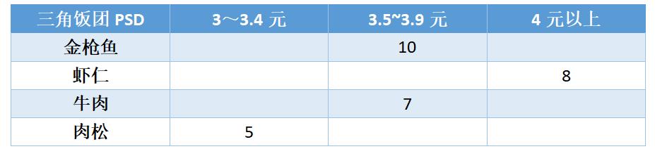 透过商品矩阵图,从中观察消费趋势,以下表为例,价格在3.5~3.9元之间是多数消费者接受的范围,海鲜口味的销量比其他口味好,采购经理就开始思考把其他海鲜食材加入,如鲑鱼、干贝等。