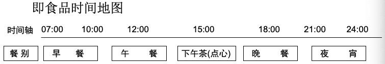 首先,以一天24小时来划分,如下表所示,一日五餐分别为早餐、午餐、下午茶、晚餐、夜宵。