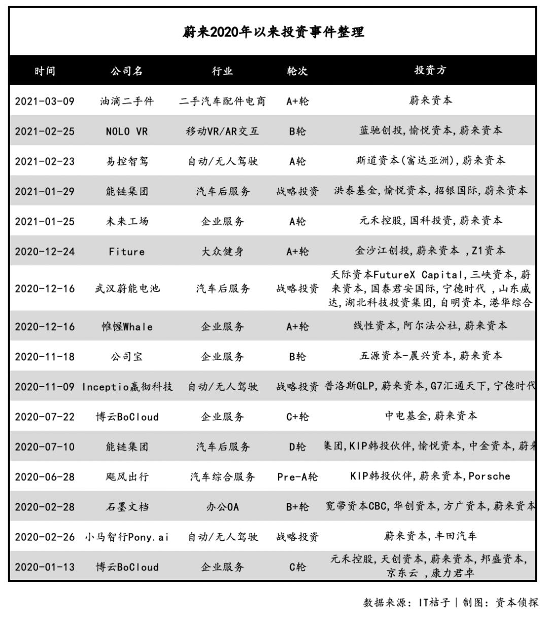 其中,着眼于高端市场的蔚来,无论造车路线、用户运营风格还是投资策略,都显得十分豪爽。蔚来本身就是新造车三剑客中融资规模最大一家,同样其也是对外投资最多的一家。