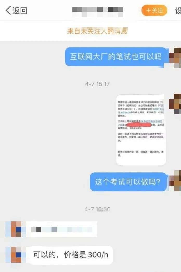 楚楚介绍称,一般大厂笔试题都是行测题+专业笔试题两部分,专业笔试题她会自己在网上复习,而行测部分则会找代考来帮忙完成。“行测题毕竟以后对我也没有用,花时间去学习以后用不到的题,得不偿失。”楚楚坦言,“有代考能通过考试,还能腾出时间让我复习专业课,肯定比我自己学要靠谱。”