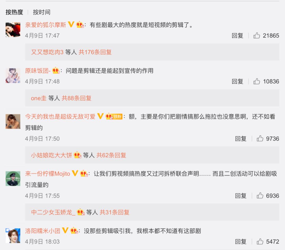 最后,当B站、西瓜视频、抖音、快手都在建立版权“护城河”,试图通过“长短视频内循环”来圈住用户时,它们对爱优腾的“导流”作用正变得越来越可疑。目前的短视频剪刀手们能在几分钟内做到“叙事性闭环”,习惯了只看高能(甜)片段的“短视频追剧”观众,可能会从此告别在线视频平台。