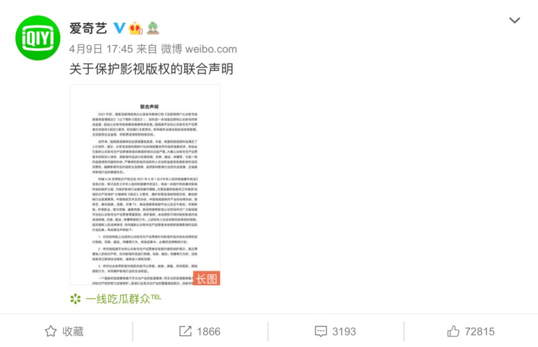 4月9日,中国电视艺术交流协会、中国电视剧制作产业协会等协会联合爱奇艺、腾讯视频、优酷、芒果TV、咪咕视频等长视频平台以及正午阳光、华策影视、新丽传媒等53家影视公司共同发布《关于保护影视版权的联合声明》,打响了近年来声势最为浩大的“版权保卫战”。
