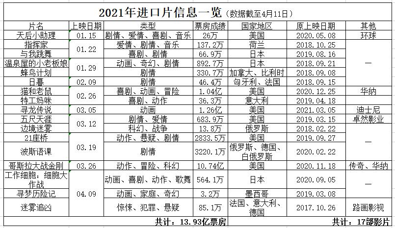 尽管今年作为防疫常态化的第一年,至今为止的国内市场上还是迎来了不少进口片上映:截至4月11日,共计17部进口片进行了院线公映。但其中破10亿的《哥斯拉大战金刚》似乎成了个例,接下来只有过审的《速度与激情9》等好莱坞大片能够维持类似的票房成绩。